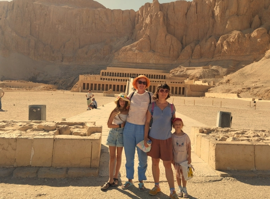 Aus der Wüstenebene erhebt sich terrassenförmig der Tempel der Hatschepsut Mergs, eingebettet in steile Kalksteinklippen an der Ostseite des Thebanischen Gebirges – als hätte die Natur selbst dieses außergewöhnliche Monument geschaffen.