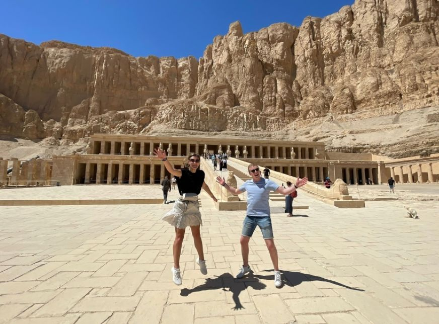 Der Tempel der Hatschepsut ist einer der schönsten und am besten erhaltenen Tempel des Alten Ägypten in Luxor. Er wurde auf drei Ebenen erbaut, die durch zwei breite Rampen in der Mitte miteinander verbunden sind. Wie aus der Wüstenebene emporragend, verschmilzt der Tempel der Hatschepsut in terrassenförmigen Gängen mit den steilen Kalksteinfelsen der Ostseite des Thebanischen Gebirges – als hätte die Natur selbst dieses außergewöhnliche Monument geschaffen.