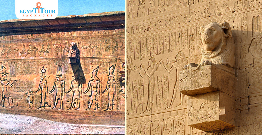 Λιοντάρι γαργκόιλ στο Ντέντερα ». Ένα γαργκόιλ με κεφάλι λιονταριού κοσμεί τον δυτικό εξωτερικό τοίχο του ναού Hathor στο Dendera, επιτρέποντας στο νερό των περιστασιακών βροχοπτώσεων να στραγγίζει από την οροφή. Η εικόνα του πιθανότατα προοριζόταν επίσης για να αποκρούσει τις κακές δυνάμεις. Αυτό το τμήμα του ναού της Δέντερας χτίστηκε κατά την ύστερη Πτολεμαϊκή περίοδο (1ος αιώνας π.Χ.). Η επιγραφή της Κλεοπάτρας Ζ΄ με τον γιο της Καισαρίωνα στον ναό της Δέντερας είναι ένα μεγάλο ανάγλυφο σκάλισμα στον νότιο εξωτερικό τοίχο του ναού. Απεικονίζει την Κλεοπάτρα και τον Καισαρίωνα να στέκονται μπροστά στη θεά Χάθορ, η οποία παρουσιάζεται στην εμβληματική της μορφή ως αγελάδα με έναν ηλιακό δίσκο ανάμεσα στα κέρατά της. Η επιγραφή είναι σημαντική γιατί δείχνει την Κλεοπάτρα και τον Καισαρίωνα να αναγνωρίζονται ως νόμιμοι ηγεμόνες της Αιγύπτου. Παρέχει επίσης στοιχεία ότι η Κλεοπάτρα ήταν σε θέση να διατηρήσει τη δύναμη και την επιρροή της, ακόμη και μετά το θάνατο του Ιουλίου Καίσαρα και την άνοδο του Οκταβιανού.