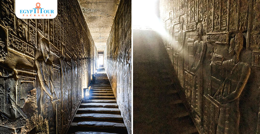Άγια των Αγίων Από την Ένατη Αίθουσα, φτάνουμε στα Άγια των Αγίων, που βρίσκεται στον άξονα του ναού. Η περιοχή των Αγίων των Αγίων είναι μια εντελώς σκοτεινή περιοχή, και μόνο ο βασιλιάς ή ο αρχιερέας επιτρέπεται να εισέλθει σε αυτήν. Περιλάμβανε την ιερή βάρκα των θεών και το άγαλμα των θεών. Οι σκηνές που καταγράφονται στους τοίχους αυτού του δωματίου δείχνουν τις ιερές βάρκες των θεών Hathor και του θεού Horus. Οι τοίχοι ήταν διακοσμημένοι. Η εξωτερική όψη του Αγίου των Αγίων, με θέα στην εισαγωγή, στη συνέχεια στη βόρεια και νότια συνοικία. Γύρω από τα Άγια των Αγίων υπάρχει ένας σχετικά ψηλός διάδρομος, στις δύο πλευρές του οποίου βρίσκουμε 11 δωμάτια, το καθένα με διαφορετικό σκοπό, που ονομάζονται κρυφά δωμάτια. Τα υπόγεια Υπάρχουν επίσης 12 κρύπτες στο ναό. Αυτές οι κρύπτες θεωρούνται το μέρος που προορίζεται για εορτασμούς, από τις οποίες παράγονται αγάλματα χρυσών θεοτήτων και τελετουργικά εργαλεία απαραίτητα για την εκτέλεση θρησκευτικών τελετουργιών. Τα πολύτιμα αγάλματα σώζονται μέσα τους και περιέχουν μια σημαντική συλλογή επιγραφών και σκηνών, συμπεριλαμβανομένων σκηνών από το άνοιγμα της πέτρινης πόρτας και του φτερωτού Κέπρι, που σπρώχνει το δίσκο του φτερωτού ήλιου μπροστά του ανάμεσα στα σημάδια του την Ανατολή και τη Δύση και άλλες υπέροχες σκηνές και γκραβούρες.