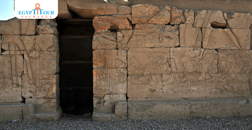 Elementi architettonici del tempio La maggior parte del tempio è stata costruita in calcare bianco e le sue colonne sono in arenaria, a forma di lettera ''L'' a differenza dei templi faraonici che sono abituati alla progettazione rettangolare, il tempio inizia con due ampi cortili, alla fine dei quali c'è una scalinata che raggiunge due sale di colonne, la prima delle quali è lunga 171 piedi e larga 36 piedi. Include 24 colonne, a forma di fasci di papiro, e i loro capitelli sono a forma di fiore non ancora aperto. Queste colonne sono disposte in due file, ogni fila di 12 colonne, su cui sono incise scene di diversi aspetti della vita di Ramses II. Una scena raffigura Khnum, il dio della creazione e dell'acqua, e una seconda scena mostra Ramses II, patrocinato da Hathor e Iside, e un'altra scena della cerimonia di purificazione del re, queste colonne formano corridoi che conducono a un'altra sala.