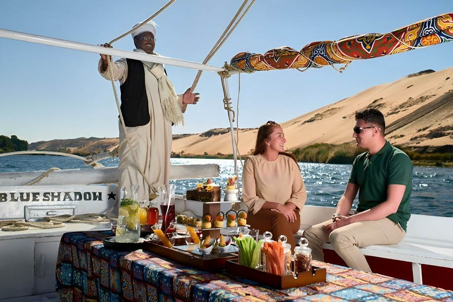 12:30 تناول وجبة الغداء على متن الباخرة النيلية أثناء الإبحار