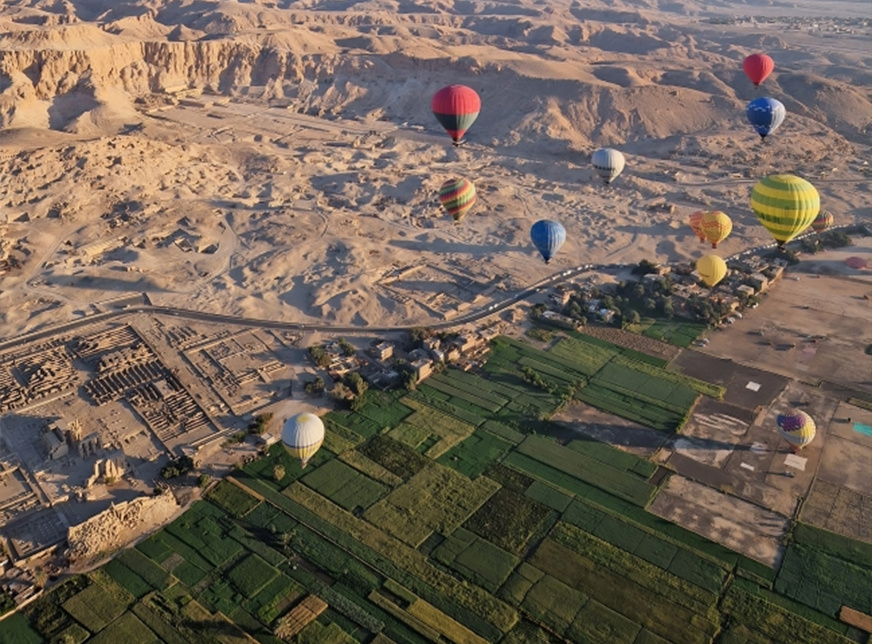 Halten Sie Ihre Kameras bereit für eine atemberaubende Ballonfahrt über die historische Stadt Luxor. Erleben Sie die ersten Strahlen der Morgensonne, die die Stadt und die umliegenden Berge in ein warmes Licht tauchen. Genießen Sie den Panoramablick auf die antiken Stätten von Luxor aus der Vogelperspektive an Bord eines Heißluftballons.