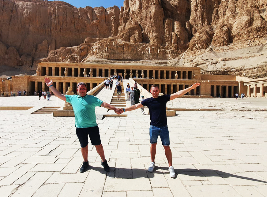Der Tempel der Hatschepsut ist einer der schönsten und am besten erhaltenen Tempel des Alten Ägypten in Luxor. Er wurde auf drei Ebenen erbaut, die durch zwei breite Rampen in der Mitte miteinander verbunden sind. Wie aus der Wüstenebene emporragend, verschmilzt der Tempel der Hatschepsut in terrassenförmigen Gängen mit den steilen Kalksteinfelsen der Ostseite des Thebanischen Gebirges – als hätte die Natur selbst dieses außergewöhnliche Monument geschaffen.