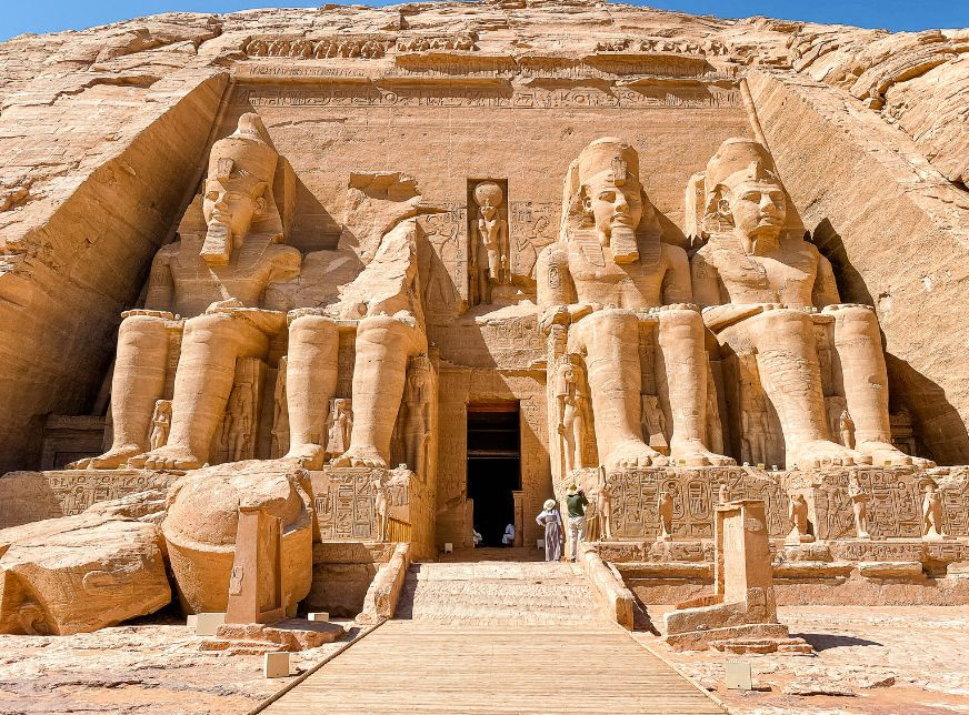 Die beiden Tempel von Ramses II. und der Königin Nefertari wurden zwischen 1274 und 1244 v. Chr. aus dem Berg am Westufer des Nils gehauen. Der Große Tempel war Ramses II., Ra-Harakhty, Amun-Re und Ptah geweiht und enthielt vier Kolossalstatuen. Der zweite Tempel war der Königin Nefertari und der Göttin Hathor geweiht. Die beiden Tempel wurden Stein für Stein abgetragen und auf höherem Gelände wieder aufgebaut. Die Erhaltung der beiden Tempel von Abu Simbel gilt als eine der größten Leistungen der UNESCO.