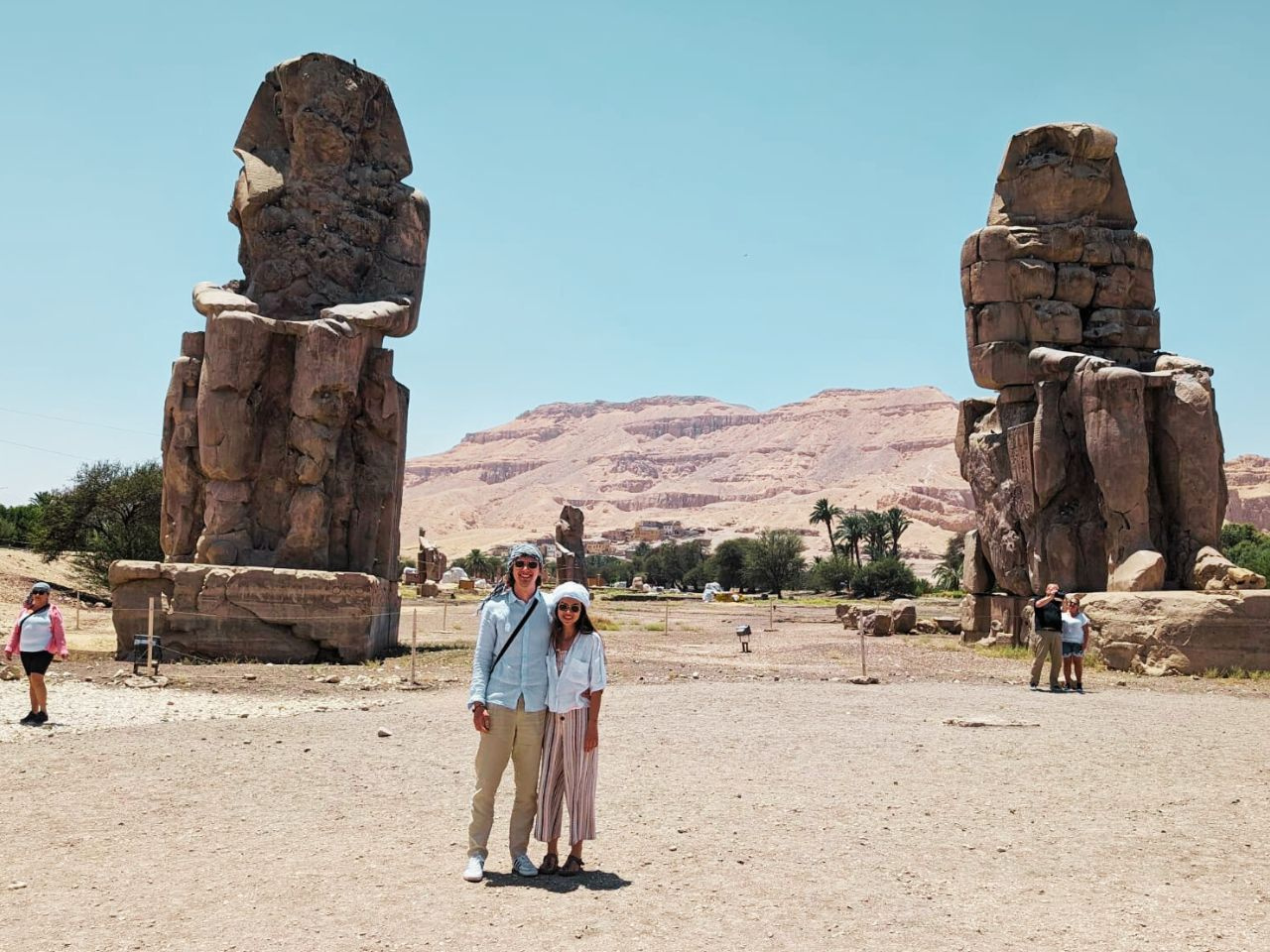 Zwei massive Steinstatuen von König Amenhotep III. sind die einzigen Überreste eines vollständigen Totentempels. Die Statuen bestehen aus Quarzitsandsteinblöcken, die in Kairo existieren und dann 700 km nach Luxor transportiert wurden.
