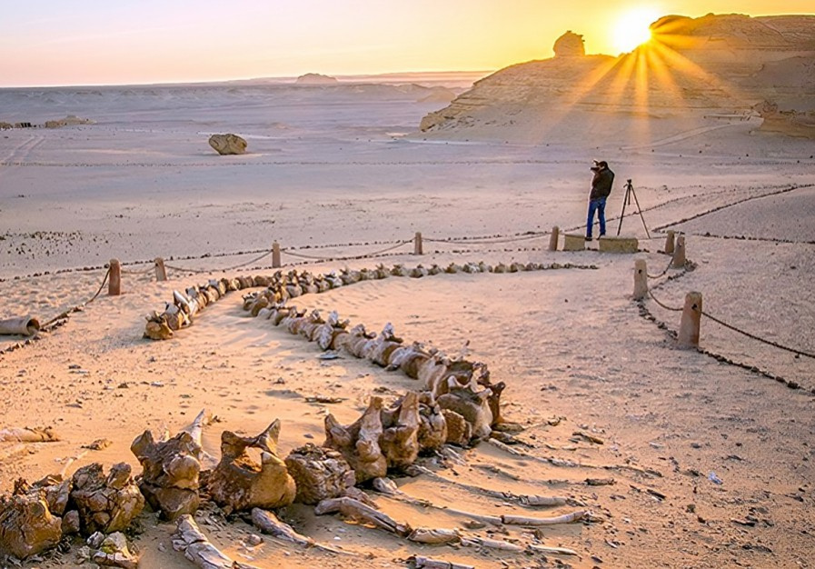 Wadi Al Hitan' est une zone protégée et un site du patrimoine naturel ajouté en 2005 par l'UNESCO au patrimoine mondial, WADI EL-HITAN est également connu pour les scientifiques de la vallée de Zeuglodon, ont été découverts en 1936, il est situé à 35 KM à l'ouest du Wadi El-Ryan, tout au fond du désert occidental, se trouve C'est une zone de fossiles ; considéré comme un musée à ciel ouvert, remonte à 45 millions d'années et contient des squelettes de baleines primitives pétrifiées, des dents de requin, des coquilles et des racines de mangroves préservées dans des roches tendres. Partout où vous allez, vous trouverez des coquillages et des coraux pétrifiés. Visitez le musée des fossiles et du changement climatique.