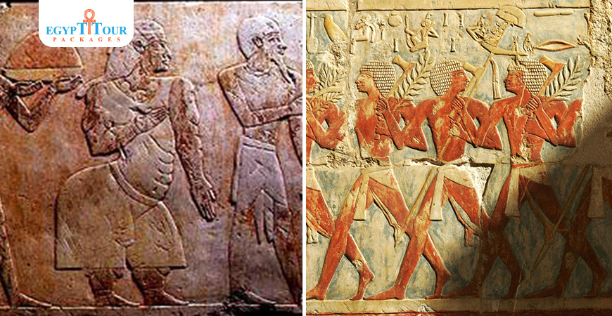 Le temple commémorant la reine Hatchepsout est situé au nord du complexe funéraire du roi Mentuhotepnebhebetre, à l'ouest de la ville de Thèbes ou de Louxor, dans une zone appelée Deir el-Bahari. Cette zone a été nommée ainsi, qui est un nom arabe moderne donné à cette zone au VIIe siècle après J.-C. après que les Coptes aient utilisé le temple de la reine Hatchepsout comme monastère. Pour eux, ce temple est situé au nord de la région, et le nord est connu sous le nom de Bahri, il a donc été appelé Deir el-Bahari en référence au monastère du nord. Les fouilles dans ce groupe ont commencé par Naville au début du XXe siècle. La mission du Metropolitan Museum dirigée par Wenlock a travaillé sur la collection dans les années 1911-1931. Temple de la Vallée : Il a été construit près de la vallée cultivée, complètement démoli. Français On y a trouvé des dépôts de meubles, d'ustensiles en albâtre, de blocs de pierre gravés et de moules en briques de terre gravés. Ces antiquités sont conservées au Metropolitan Museum, au Musée égyptien et au British Museum. Voyage au Puntland : Je crois que le voyage de la reine Hatchepsout au pays de Pount est considéré comme l'un des événements les plus importants qui se soient produits pendant le règne de la reine en Égypte. Il s'agissait d'un voyage commercial qui a eu lieu dans la huitième année de son règne, et nous avons appris par les écrits que la reine a inscrits sur les murs de son temple à Deir el-Bahari. Elle mentionne au début de ces écrits que le dieu Amon était celui qui l'a inspirée à entreprendre le voyage et lui a ordonné de se rendre au pays de Pount afin d'apporter l'encens, les teintures et les parfums nécessaires à la pratique des rituels divins. La chaussée : s'étendait du temple de la vallée et atteignait la cour des rituels du temple. Cette route était ouverte et sans toit. De chaque côté, à égale distance, se trouvaient des statues de la reine en forme de sphinx. Cette route comprenait une halte pour le bateau d'Amon. Une astraka avec vue sur cette halte a été trouvée à Deir el-Bahari, qui est conservée au British Museum.