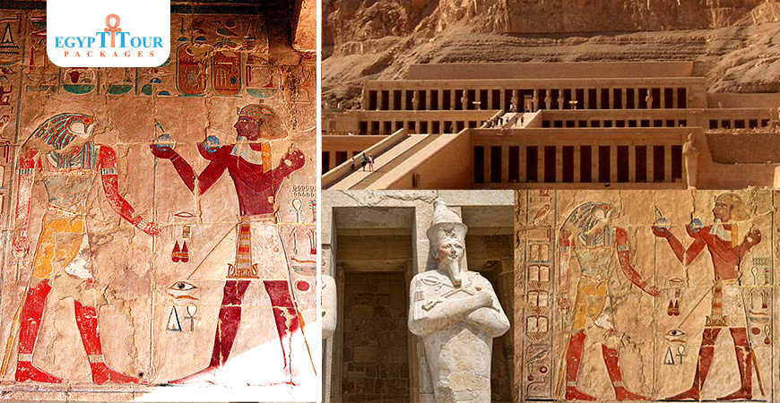 Le sanctuaire d'Hathor. Au deuxième niveau, un auvent sud se compose d'une partie construite et d'une autre partie creusée dans la roche. Les scènes de cette structure représentent la relation d'Hathepsout et de Thoutmosis III avec les dieux, dirigés par Hathor, et il y a des vues de Senmout en train d'adorer.