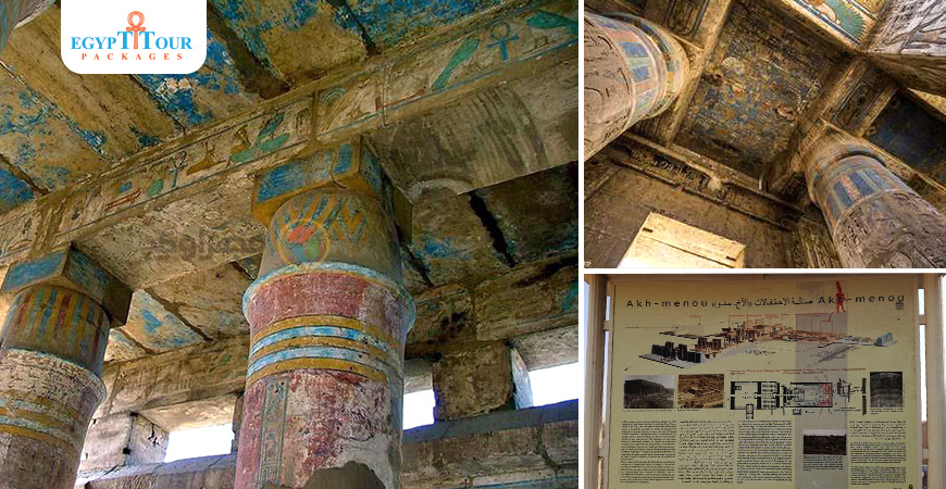 - Le temple de l'Aakh Meno : Il a été construit par le roi Thoutmosis III dans la 25e année de son règne à l'occasion de la célébration de la fête de la Sainte-Cène. Le temple comprend une cour des maîtres, le Saint des Saints, des réserves et une salle décorée de scènes de plantes, d'animaux et d'oiseaux que Thoutmosis III avait ramenés d'Asie lors de sa campagne. Il possède quatre colonnes et est situé à côté du Saint des Saints et est appelé le jardin des plantes. Il contient une plaque contenant une liste des noms des rois qui s'intéressaient à Karnak qui est aujourd'hui conservée au musée du Louvre.