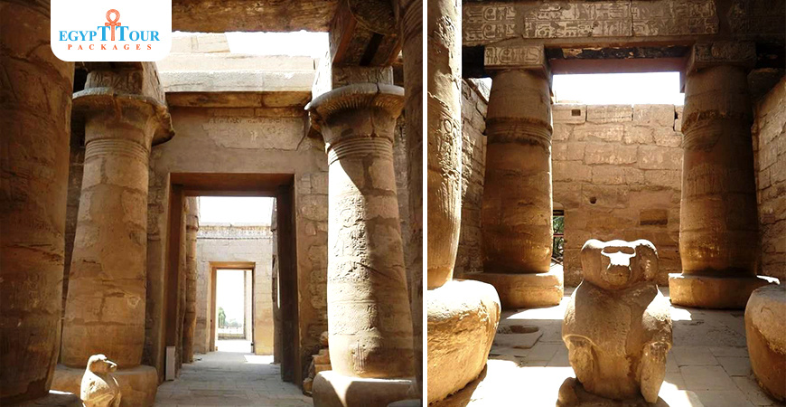 - Temple de Khonsou : Sa construction a commencé avec Amenhotep III, et il a été complété par Ramsès III, IV, X, XI, puis d'autres rois, et il se compose d'un édifice, d'une cour à piliers, d'une salle à piliers, puis du Très Saint, et d'entrepôts. Le temple de Khonsou comprend une statue de "Khonsou" sous la forme d'un singe, et ses murs sont décorés de scènes de Ramsès IV. Les lieux de culte des deux côtés du temple ont des couleurs bien préservées dans des scènes montrant le roi et d'autres courtisans. Derrière le temple, il y a une petite salle pour le dieu "Khonsou" avec 4 colonnes pour chacune. Colonne 16 côtés.