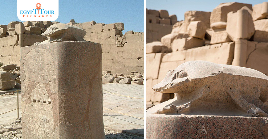 -Scarabée : A côté du lac sacré, se trouve une sculpture en granit posée sur un immense socle gravé d'une scène d'Amenhotep III agenouillé, offrant des sacrifices à Atoum. Cadeau du roi Amenhotep III à sa femme, la reine T, pour que leur amour dure. Les Egyptiens et les étrangers le parcourent pour lui porter chance et lui souhaiter bonne chance. Les femmes enceintes veulent le bon garçon, les filles et les jeunes recherchent le mariage, et des centaines d'étrangers parcourent les 7 tours pour porter chance et exaucer leurs vœux. C'est le scarabée sacré du temple de Karnak à Louxor.