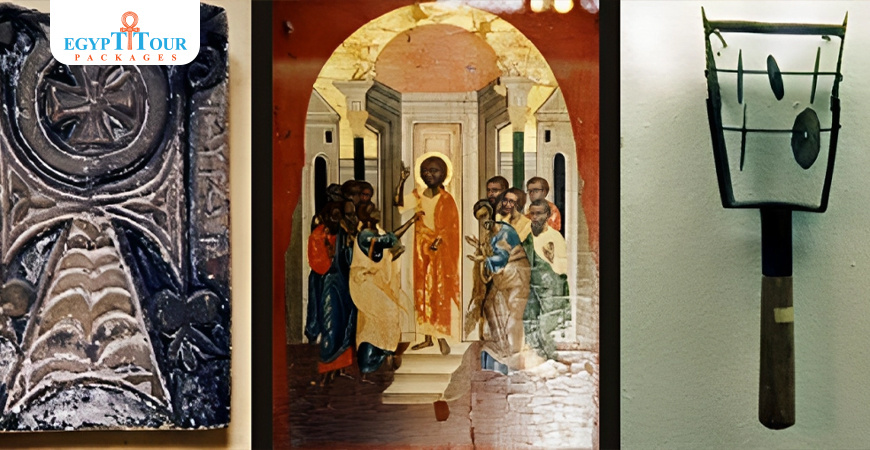 Ci sono splendide esposizioni di tessuti, arazzi e icone tessute con disegni dettagliati ispirati a temi religiosi. Inoltre, ci sono squisiti esempi di lavorazione della pietra, della ceramica e del legno, come la straordinaria scultura conosciuta come la "Petizione dei ratti", in cui tre ratti alzano una bandiera bianca davanti a un gatto. Sono esposti anche numerosi testi e scritture copte. Tra i reperti c'è un'aquila di bronzo scoperta nella fortezza romana di Babilonia. 1 Croce copta a forma di ankh 2 Affresco copto raffigurante Cristo e i Discepoli 3 Strumento musicale utilizzato nel rituale copto
