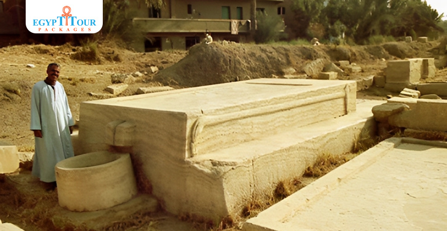 Il tempio dedicato a Ptah è ora in gran parte coperto da coltivazioni. Ptah, insieme a Sekhmet e Nefertem, formava la Triade