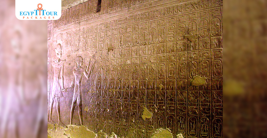 Le iscrizioni e le sette sale di preghiera Le iscrizioni che decoravano le colonne di questa sala risalgono all'epoca di Seti I, ed è una delle cose più belle create dall'antico modello egizio, soprattutto perché gli dei che erano rappresentati con teste umane erano incisi nella stessa posizione laterale in cui era incisa la statua del re Seti I. La seconda sala termina con 7 sale di preghiera, a partire da A destra c'è la nicchia di Hor, seguita dalla nicchia di Iside, poi Osiride, Amon, Hor-akhti, che significa il capo degli dei, e Ptah, e l'ultima sala verso sinistra è la nicchia di Seti I. Si nota che le nicchie non avevano porte dietro di loro, tranne la nicchia di Osiride, che aveva una porta che conduceva a una sala con colonne. Sfondo raffigurante la trinità degli dei Osiride, Iside e Horus. Alla fine del muro sinistro della seconda sala ipostila, ci sono due porte, una delle quali conduce a una sala composta da tre sale dedicate agli dei Nefertum e Ptah-Soker. La seconda porta conduce a tre ingressi. Il primo termina con un lungo corridoio alla fine del quale c'è una lunga scalinata che raggiunge una stretta uscita laterale che conduce al soffitto e al secondo ingresso. Il terzo termina con cinque sale contenenti un elenco dei re di Abydos dalla prima dinastia alla diciannovesima dinastia, e il loro numero raggiunge i 76 re, a partire dal re Menes, l'unificatore dei due paesi, fino al re Seti I, anche se va notato che il nome della regina Hatshepsut e i nomi dei re dell'era della riforma religiosa, cioè Akhenaton e i suoi figli, non vi erano scritti.