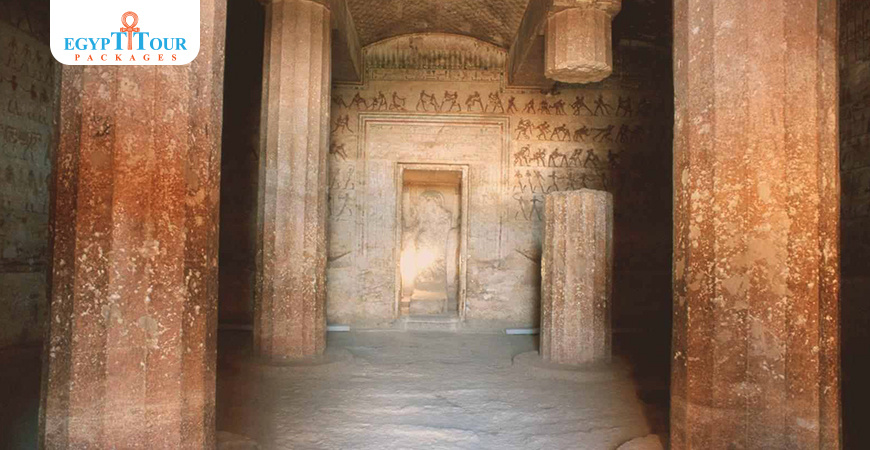 Khnumhotep II was the son of Amenmehat, Khnumhotep’s power as a governer for Menat – Khufu province was less than his ancestors, but he followed the architectural style of his father, as it is consisting of a courtyard and a portico with columns which leads to the main chapel of the tomb. The tomb is unique, as it includes the owner's autobiographical text has been carved in the base of the walls and it is well preserved, the other feature is having some beautiful portraits for khnumhotep and his family.