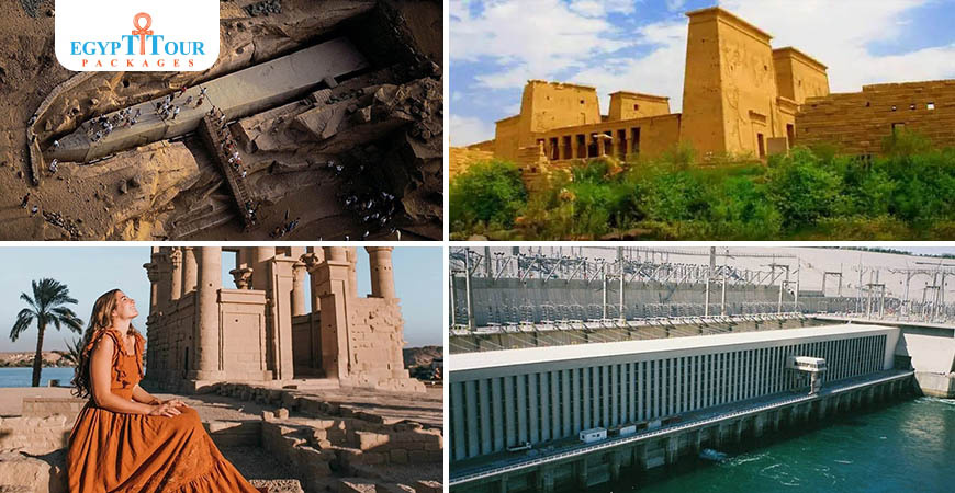 Day three: You'll be picked up from your hotel in Cairo and taken to Cairo Airport for a short flight to Aswan, where you'll then transfer to the Cruise. Once on board, you'll have lunch and start your visits in Aswan. First stop is the Temple of Philae, dedicated to the goddess Isis. Next, you'll see the impressive Aswan High Dam, followed by a visit to the The Unfinished Obelisk was discovered in the early twentieth century after it had been covered by sand for thousands of years. Unfinished Obelisk . After lunch on board, enjoy a sailing trip with Felucca around Elephantine island and visit Lord Kitchener island. You also have the option to visit the Nubian village, known for its colorful streets and unique culture. Spend the night on board the Cruise.