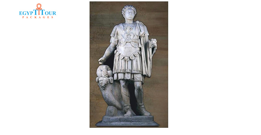 It is a large statue of the emperor standing wearing a sash and a decorated shield with a bas-relief carving depicting Medusa, a cross, and two lions with the wings of an eagle.He appears next to the Emperor Qarn al-Khairat, holding a sword in his left hand.