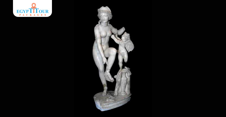 It was found in the Sidi Becher area. The statue depicts the goddess Aphrodite and her son Eros as she is about to bathe She puts her sandals aside on a bowl.She wears a crown and wears two bracelets in the shape of a snake on her arms. The statue is missing the left forearm.