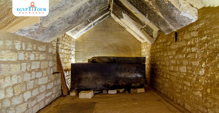 In the interior you can see portions of the hieroglyphic spells of the Pyramid Texts up close, as well as a shower of stars. Within the intact burial chamber, Teti's basalt sarcophagus is well preserved, and represents the first example of a sarcophagus with inscriptions