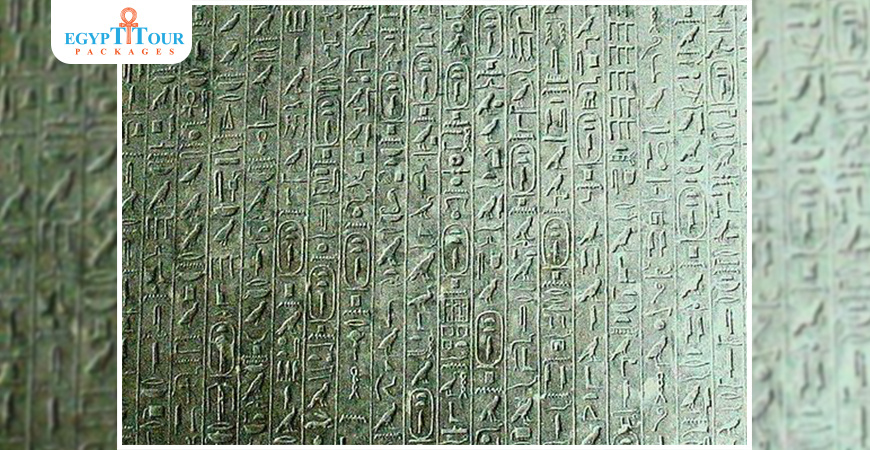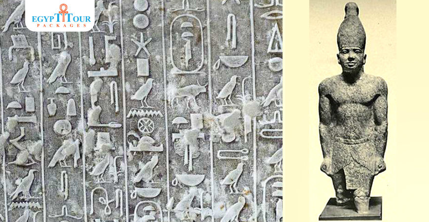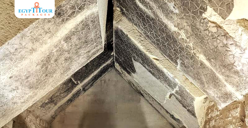 A truss-shaped ceiling in the king’s burial chamber comes from his pyramid in Saqqara, bearing inscriptions in the form of stars of extreme beauty and creativity.