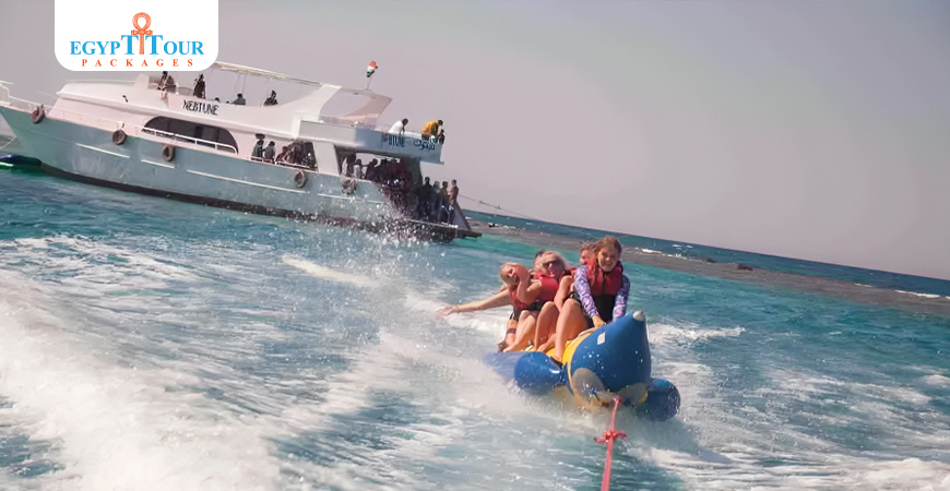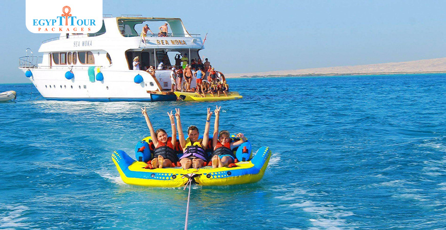 islands. Book your speedboat ride now to Orange Bay or Paradise Island. Spend 4 hours visiting these beautiful islands with your family and enjoy lunch there. Look for dolphins in their natural environment on a 4-hour tour. Experience the vibrant marine life and breathtaking coastal views of the Red Sea. You can watch dolphins up close and, if possible, swim with them. Speedboat trips from