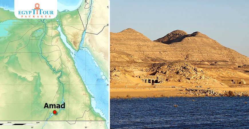Amada temple was moved about 2.6 Km from its original location; it's 115 Km south of Aswan and 110 miles south of the High Dam.