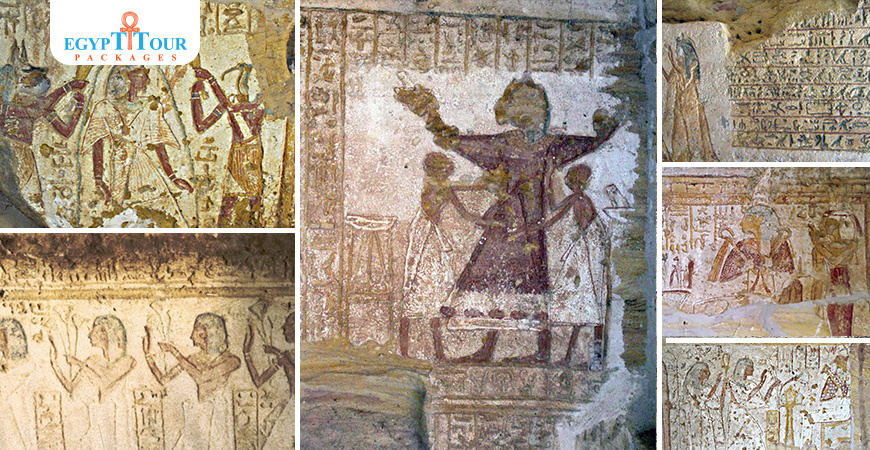 The chamber has scenes of Pennut offering to the gods, and others represent the funeral, and the final judgments. The scenes on the right hand (east) side depict life in this world, those on the left-hand side the life Beyond. There are two registers on all the walls. To the left of the entrance are Pennut and his wife in prayer. The chamber has scenes of Pennut offering to the gods, and others represent the funeral, and the final judgments.